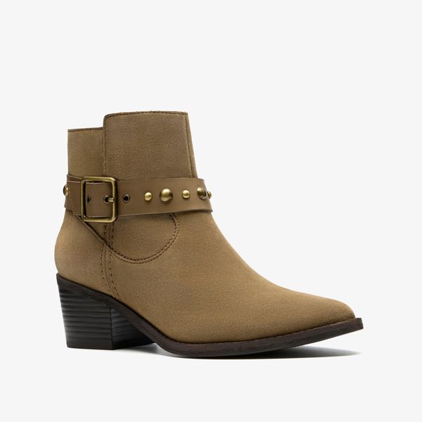 Ankle boot Morzine Buckle lands in soft dark sand suedes for a classic, premium look. We’ve completed the pair with authentic top stitching, gold-tone buckles and a super-soft footbed for total comfort and a polished aesthetic. And , offering easy-walk support that powers every move, it’s all tied together with an ultra-wearable stacked heel.
