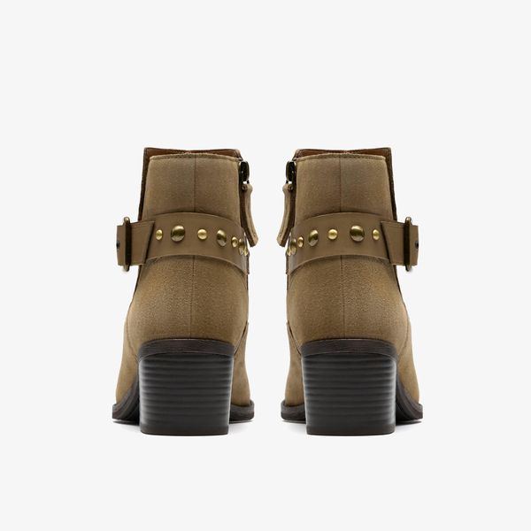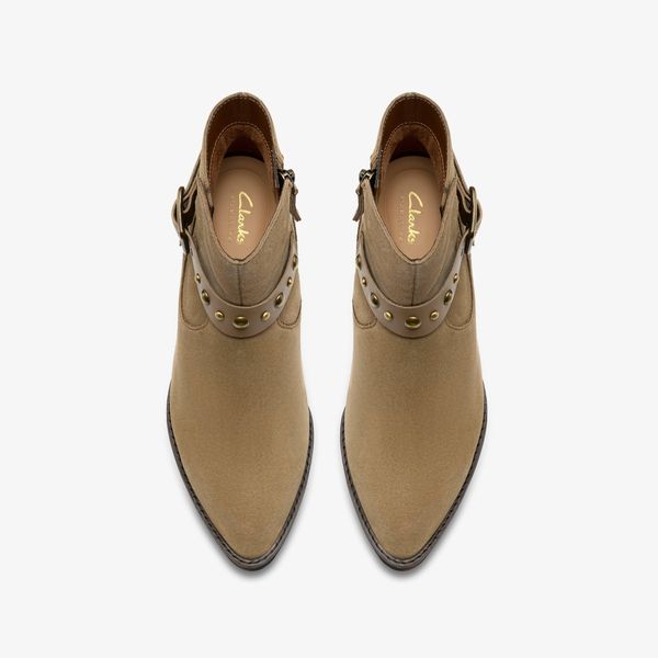Premium dark sand suede upper with gold-tone studs and buckle hardware